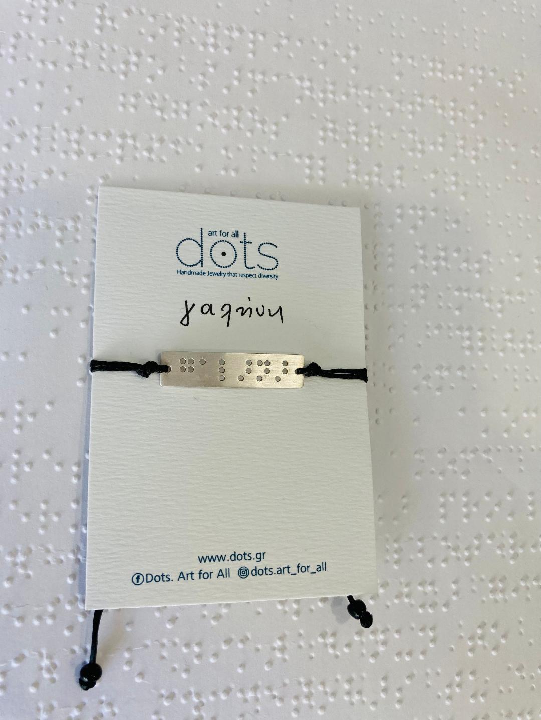 Βραχιόλι με τη λέξη “γαλήνη” στην γραφή Braille με μακραμέ δέσιμο.