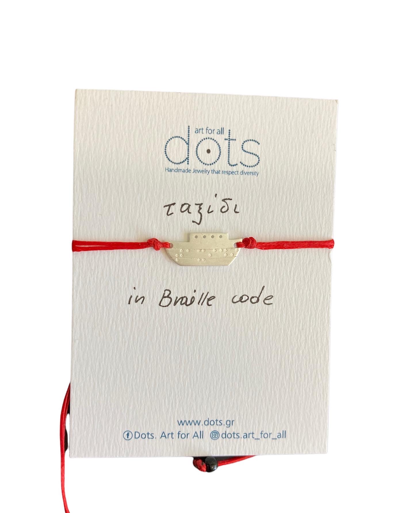Βραχιόλι καραβάκι με τη λέξη ”ταξίδι” χαραγμένη στη γραφή Braille.